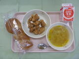今日は一段と寒さが厳しくなりました。そんな時期にぴったりな献立、ベーコンスープが登場しました。キャベツの甘さ、やさしさを感じられた一品で児童のみなさんもよく食べていました。たちうおフライは、外はサクサク、中はふんわり仕上がりまして、パンに挟んで食べている児童が多くみられました。小松菜のソテーは、ニンニクの香りが食欲をそそる味わいでした。