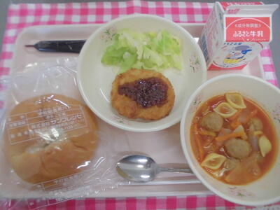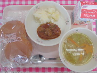 子供パン 牛乳 ハンバーグデミグラスソース こふきいも 野菜スープ(ラッキーにんじん)