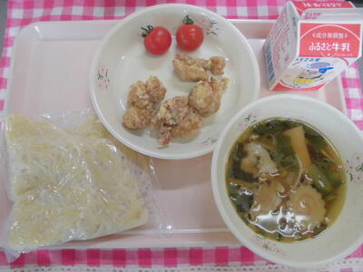 和だしラーメン 牛乳 とりのから揚げ ミニトマト