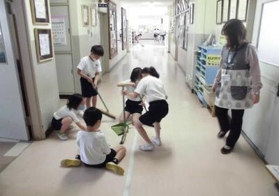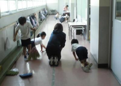 清掃時間、教員とともに一生懸命に働く子供達。