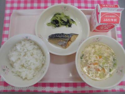 ごはん、牛乳、さばの幽庵焼き、小松菜の炒め物、かきたま汁