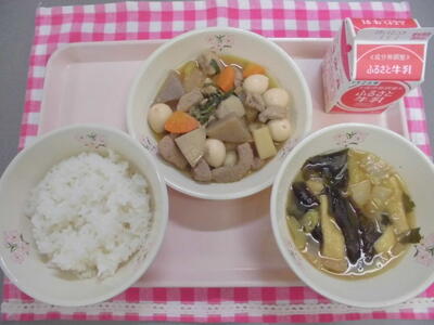 今日は、だしやうま煮といった食材のおいしさを存分に感じられる献立でした。豚肉とうずらの卵のうま煮は、しょうがが効いていたり、さまざまな食材を楽しめる料理でした。豚肉は角切りのもも肉を使用したので、うま味が染みていて噛み応えがありました。うずらの卵は、丸飲みしないように低学年に声かけをしました。