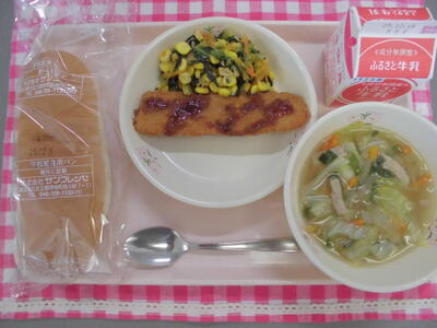 コッペパン、牛乳、たちうおフライ、小松菜のソテー、ベーコンスープ