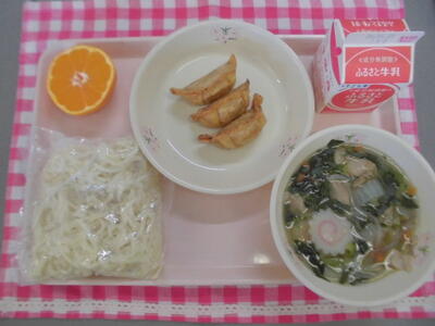 今日は、長崎ちゃんぽんでした。豚骨・鶏ガラベースの白濁スープに太くてコシのある麺、豚肉・魚介・野菜がたっぷり入った麺料理で、本日は給食用にアレンジして作りました!豚肉や野菜、いかやなるとが入って具だくさんで美味しく仕上がりました!ぎょうざとの相性も抜群でどんどん箸が進みます。みかんは久々の花みかんでした!切り方を一工夫するだけで、可愛くて、一年生の一口サイズで食べやすくなって、一石二鳥ですね♪