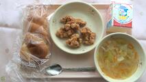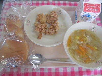 ツイストパン 牛乳 とりのから揚げ 野菜スープ
