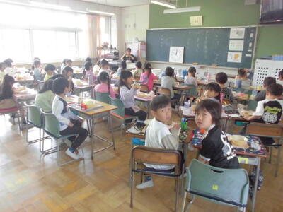 本日より1年生は給食開始でした。給食着の着方や配膳・牛乳パックへのストローのさし方など、初めてのことが沢山でしたが、びっくりするほど落ち着いて配膳が終わり、片付けも一人一人が自分の分をきちんと行ってくれました。スープには野菜がたっぷり入っていましたが、どの学年でもほとんど残りはありませんでした。野菜が苦手な様子の児童も「少し残しちゃった」と言いつつも、半分は食べてくれていました。