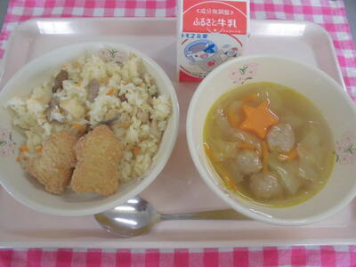 チキンピラフ 牛乳 いかナゲット ミートボール入り野菜スープ(ラッキーにんじんの日)