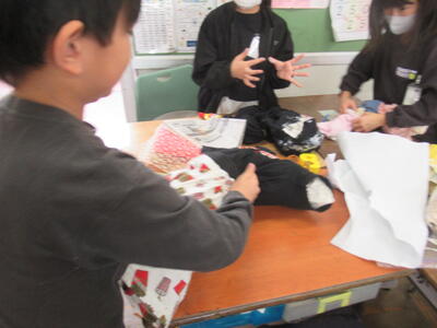 着られなくなった衣類に、学校で使用しなくなった新聞紙を詰め物にすることで、膨らみや量感をもたせることができました。また、輪ゴムやモールでしばると、形のメリハリをつけることに気がつきました。
