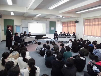 はじめに、大東文化大学 特任教授 渡辺雅之氏によるいじめ予防授業「なぜ、いじめはなくならない?」を受けました。