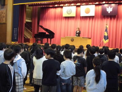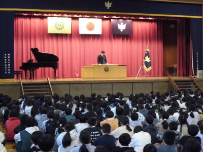冬休みの生活について、安全第一、交通事故には十分気を付けるように話しています。