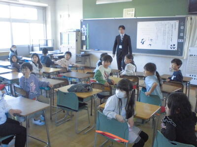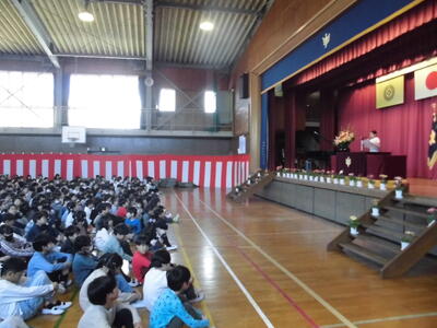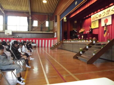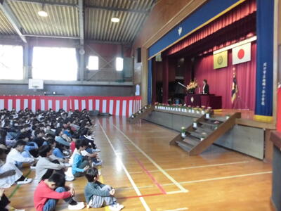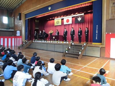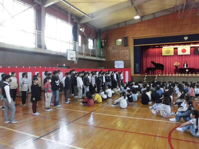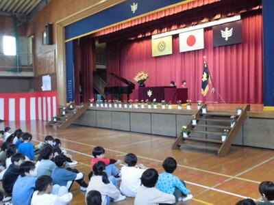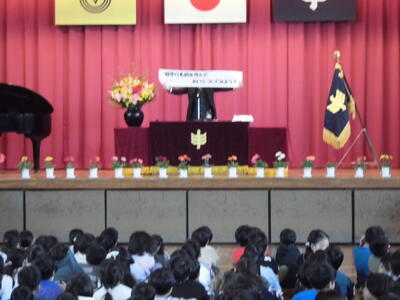 始業式では、春休み中に6年生が準備登校し、新入生の教室をきれいにしたり、荷物移動したりしたことを話しました。